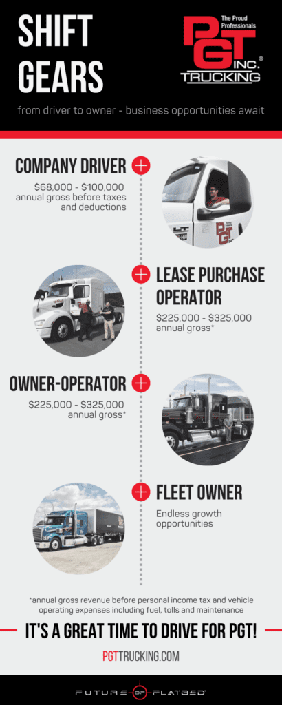 PGT Trucking understands that there is no one-size-fits-all career goal for truck drivers. Every truck driver has different needs for revenue, home time and equipment, which is why PGT offers multiple career options, helping truck drivers find their best fit. A Company Flatbed Truck Driver position is perfect for someone who just earned their Class A CDL. PGT’s Lease Purchase Program is a great way for aspiring Owner-Operators to get their first truck or even begin growing their own fleet. No matter what your career goal is, PGT will find the right flatbed trucking job for you. Let’s explore how you can advance your trucking career with PGT.