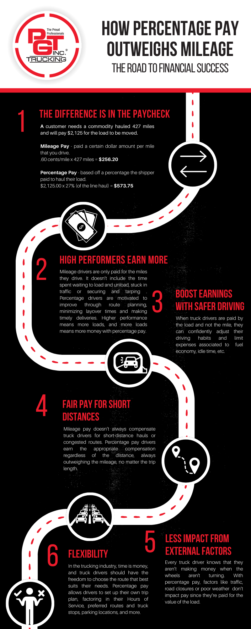 Кога возачите на камиони се платени по километар, тие не секогаш добиваат дел од профитот на компанијата. Со процентуална плата, камионските компании и нивните возачи на камиони имаат взаемно вложување во профитот на компанијата. Возачите на камиони со рамно лежиште заработуваат процент од приходот, а кога компанијата заработува повеќе, тоа го прави и возачот. Двете страни се посветени да и помогнат на другата да успее, и благодарение на PGT's